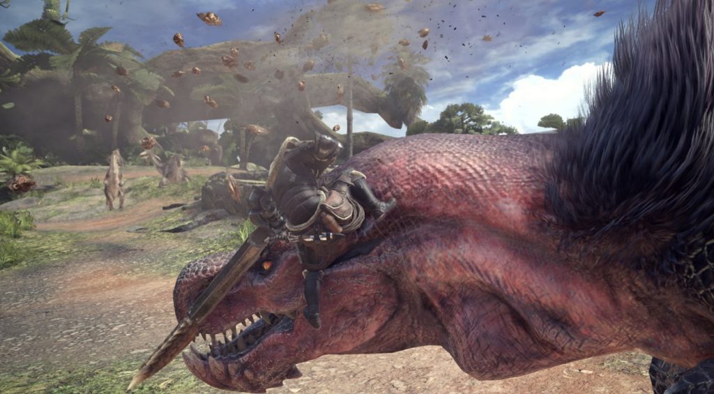 捕食対象の豊富な古代樹の森を縄張りとする蛮顎竜(ばんがくりゅう) アンジャナフ。非常に好戦的で他のモンスターに対しても躊躇なく襲い掛かる