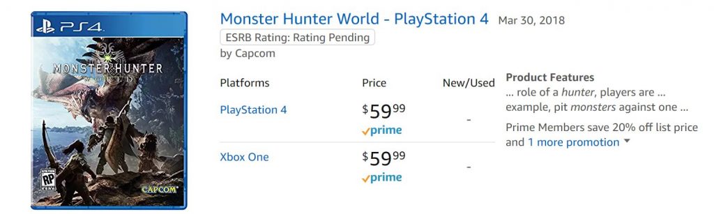 米国のアマゾンではすでにモンスターハンターワールドの予約が始まっております。パッケージ版のみの販売となっておりますが、値段は$59.99、日本円に換算すると6578円ぐらいです。想像していた以上に安い値段で販売されているようです。