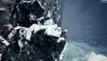 アイスボーンから新たに追加される新マップ「渡りの凍て地」は、寒冷地なので雪が降っており非常に寒いエリアです。今までのモンハンシリーズにも雪のマップはありましたが、過去作では絵的にも今までできなかった表現。例えば、雪の表現であったり、雪が深い場所では、歩いた場所がちゃんと道になります。