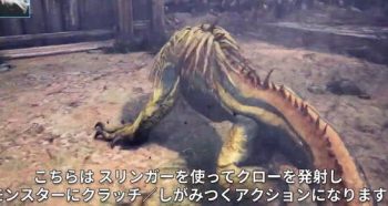 スリンガーを用いた新アクション「クラッチクロー」。こちらはスリンガーからクローを発射しモンスターにしがみつくことのできるアクションです。