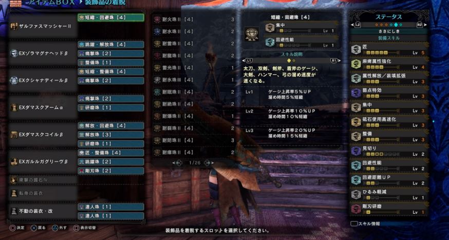 ザルファ麻痺運用を考えてるんだが匠5+斬れ味補助+解放とか積んでると他の補助スキルが全然積めなくて辛いわ
