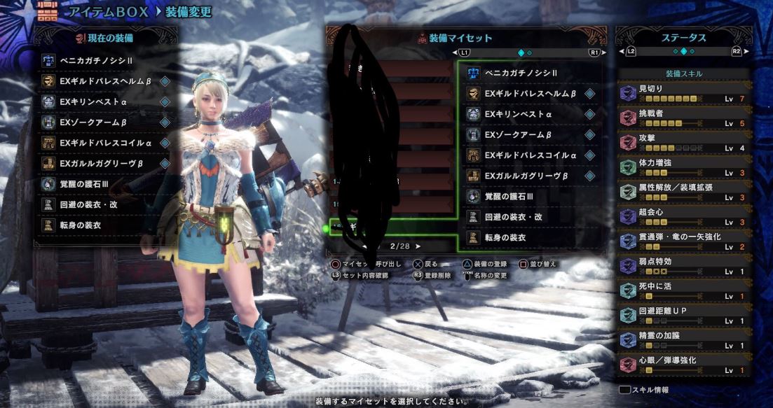 貫通ヘビィ渾身5で会心率100%運用するんだったら、達人7にしなくてもナルガ砲なら1回、カガチ砲なら2回会心カスタムすれば達人6、渾身5で100%行けるから楽になったね