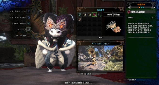 おすすめのオトモ防具は、とくにありません。もちろん防御力が高いゼノジーヴァ系のオトモ防具が一番強いとはいえますが、今回のオトモ猫は、体力が多く死ぬことはないので、自分の好きな猫防具のデザインで選んでしまって問題ないです。