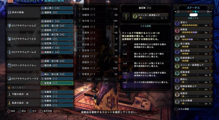 挑戦者7、見切り7、砲術5、ガ性5、弱特3、体力3、投石3、回避距離3、増弾1、地質学1、耐衝1、ガ強1付いたよ