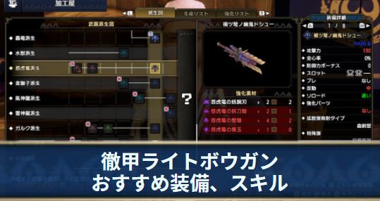 • 攻撃Lv7発動の徹甲ライトボウガンの最強クラスの火力を出せるおすすめテンプレ装備です。砲術Lv3・攻撃Lv7に加えてマガイマガドライトに必要なボウガンスキルが発動しています。