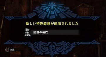2番の条件をクリアした後に、武具屋のおばさんに話しかけるとフリークエスト★9「新大陸の空と花」を受注できるようになりそれをクリアすることで、回避の装衣を入手できます