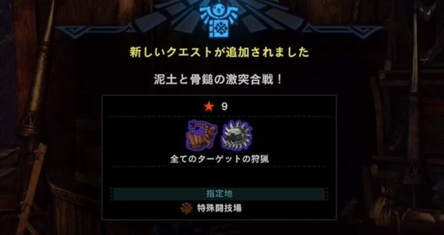 2番目の条件をクリアした後に、武具屋にビックリマークが出現するので話しかけるとフリークエスト「★9:泥土と骨鎚の激突合戦」を受注できるようになります。これをクリアすることで、強打の装衣を入手することができます。