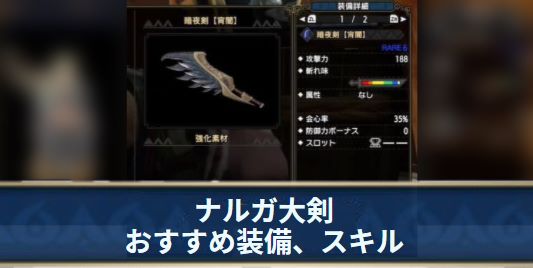 • 護石スロ21で組めるナルガ大剣のおすすめテンプレ装備です。ナルガ大剣が必要なスキルが揃っているうえに、攻撃や弱点特効、集中などが高いレベルで発動しています。簡単に組めるかつ最強のおすすめテンプレ装備です。