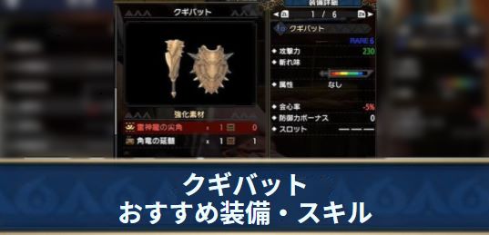クギバットは現状ナルガ片手剣と並ぶ、最強の片手剣です。攻撃力は全片手剣の中でもトップクラスの230、会心率は-5%です。