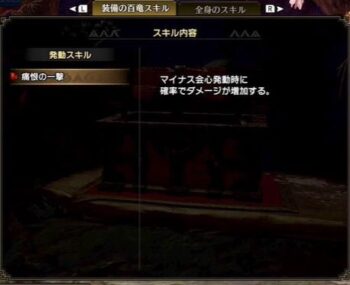 会心を入れない攻撃特化のディアブロスランスの場合、百竜スキルは「痛恨の一撃」がおすすめです。マイナス会心が発動したときに、確率でダメージが発動します。