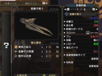 ラージャンのヘビィボウガンで、スロット③で攻撃力は210とヘビィボウガンでも高めです。麻痺弾Lv1とLv2が撃てるので拘束力にもたけています。