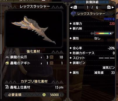 • 剛刃研磨運用のレックスラッシャーテンプレ装備です。マイナス会心をそのままに攻撃Lv7まであげ、その他スラアクに必要なスキルが揃っています。この装備の百竜強化は「痛恨の一撃」がおすすめです。