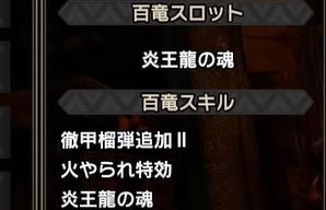 テオ=アーティレリの強みでもある「炎王龍の魂」がおすすめです。徹甲榴弾追加Ⅱも強く、この百竜強化を積めば装填拡張を積む必要が無くなります。