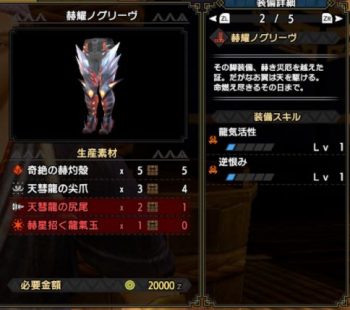 | 赫耀ノグリーヴ・真 | 天彗龍の剛爪×3 赫星招く龍神玉×1 奇絶の赫煌殻×5 天彗龍の旋尾×2 |