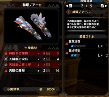 | 赫耀ノアーム・真 | 炎龍の剛翼×2 天彗龍の剛爪×2 天彗龍の大背尖甲×2 赫揺れる厚龍鱗×6 |