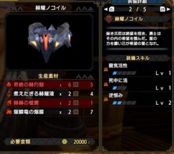 | 赫耀ノコイル・真 | 爆鱗竜の爆腺束×2 煉獄滾る赫輝液×2 奇絶の赫煌殻×6 赫赫の撃槍翼×2 |