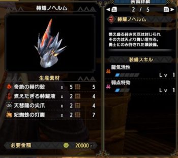 | 赫耀ノヘルム・真 | 妃蜘蛛の爛灯腹 ×2 天彗龍の剛爪×2 煉獄滾る赫輝液×2 奇絶の赫煌殻×5 |