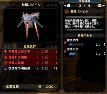 | 赫耀ノメイル・真 | 怨虎竜の魂魄結晶 ×2 天彗龍の大背尖甲×2 赫赫の撃槍翼×2 赫揺れる厚龍鱗×6 |