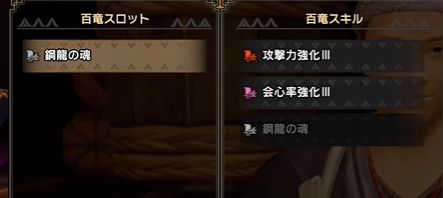通常弾Lv3運用の場合は、固有の百竜スキル「鋼龍の魂」で最大30%と会心率を上げることが出来、元から10%あるので武器だけで会心40%あります。