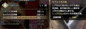 依頼時にレアアイテムが出やすくなる「キラキラ交渉術」を使っておくと、レア素材を入手しやすくなります。キラキラ交渉術は、Lv25以上のオトモにしか使用できないので注意。