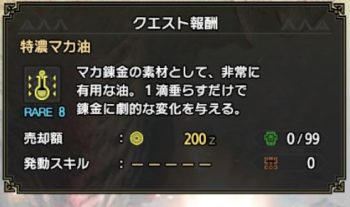 特濃マカ油はMR★★★★★★(6)や傀異化クエストの報酬として入手することができます。今回は、特に特濃マカ油を効率よく入手できるクエストと、周回用装備について紹介していきます。
