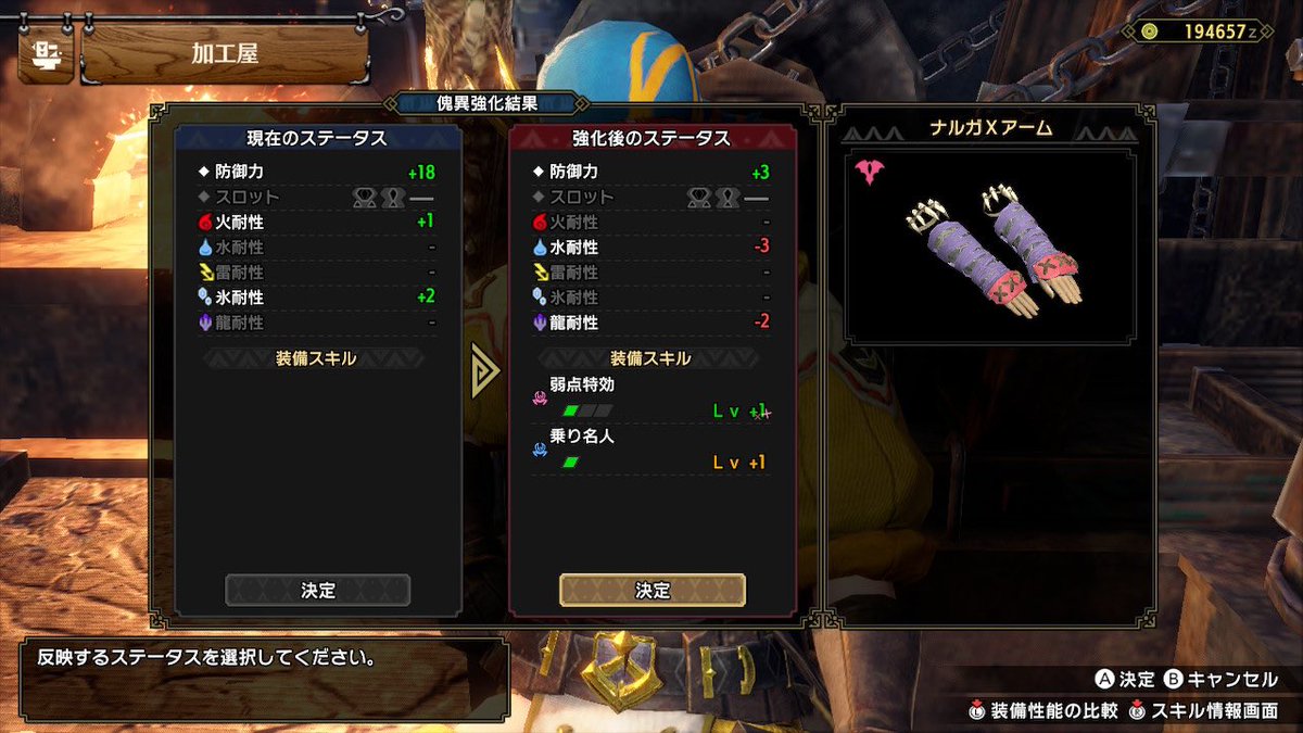 同じレア度の防具ならリセットしても抽選結果が変わらないから好きなスキルを好きな防具につけることはできるな。例えばインゴット脚でガチャ回してる中でスタ急みたいな弓でしか使わないスキルで良い結果が出たら一回セーブせずにリセットすることでナルガX腕に付け直すとかが出来そう。