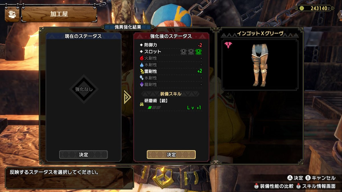 まずレア8のインゴットX脚を錬成すると弱点特攻+1と雷耐性+1が追加された
