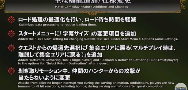 前から言われていた文字の小ささの改善や、クエストの帰還先の選択に「集会エリア」に戻るを選択できるようになったり、剥ぎ取りモーション中に仲間のハンターからの攻撃が当たらないように変更されました。