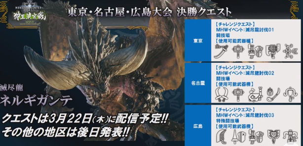 決勝クエストはターゲットモンスターはネルギガンテで共通ですが、大会が開催される場所によって使用できる武器種が変わってきます。このクエストを受注するにはHR16以上まで上げる必要があります。