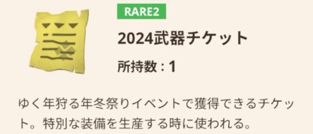 2024武器チケットは、ボーン武器(竜骨武器)シリーズの生産素材として使用可能です。クエストでしか入手できないので注意。