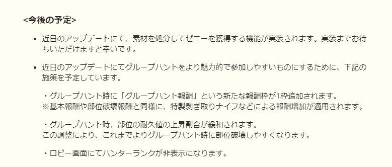 大連続狩猟ポイントのリンクを実装しました。一部地域にてマッチングしやすくなる施策として試行していた、異なる場所にある大連続狩猟ポイントをリンクする機能を全世界に展開いたしました。