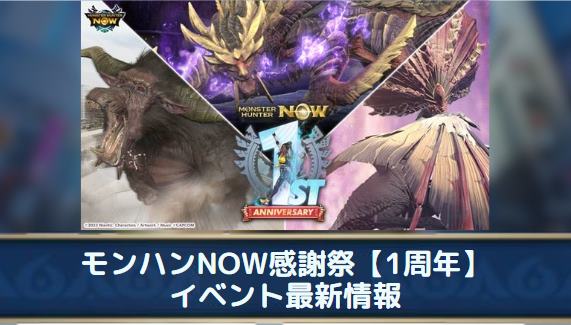 モンハンNow(モンハンナウ)のモンハンNow感謝祭【1周年】まとめです。モンハンナウの「モンハンNow感謝祭【1周年】」で貰える報酬やイベント情報を掲載しています。