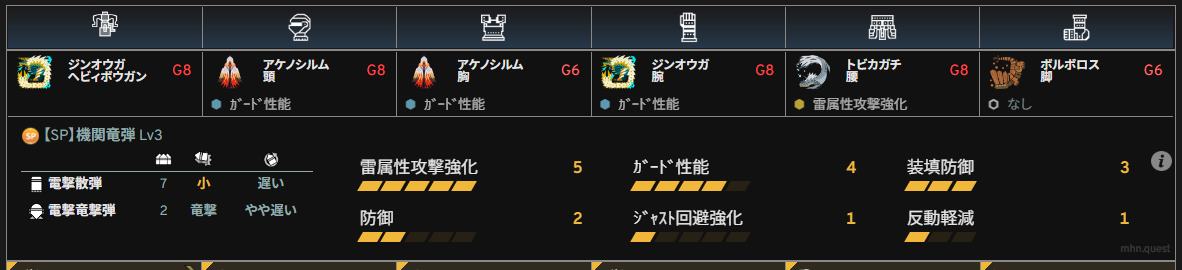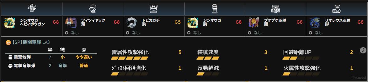 雷属性攻撃強化Lv5 / 装填速度Lv3 / 回避距離UPLv2 / ジャスト回避強化Lv1 / 反動軽減Lv1 / 火属性攻撃強化Lv1