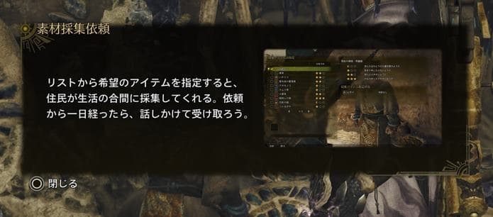 素材採集依頼は、各マップの住人に特定のアイテムを収集してもらえるシステムです。これを活用すれば、ハチミツなど不足しがちなアイテムを安定して確保できます。さらに、採集量はフィールドの環境状況によって変動します。