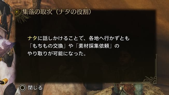 素材の受け取りや依頼の指定は、マイキャンプ付近にいる「ナタ」からも行えます。毎回各マップまで取りに行く手間を省けるので、ナタに話しかけて効率的に管理しましょう。