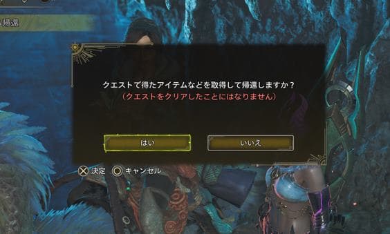 魚を捕獲したら、クエストを帰還します。その後、洞窟湖に戻り、再度魚を捕獲。手順③から繰り返すことで、無限ループが可能です。