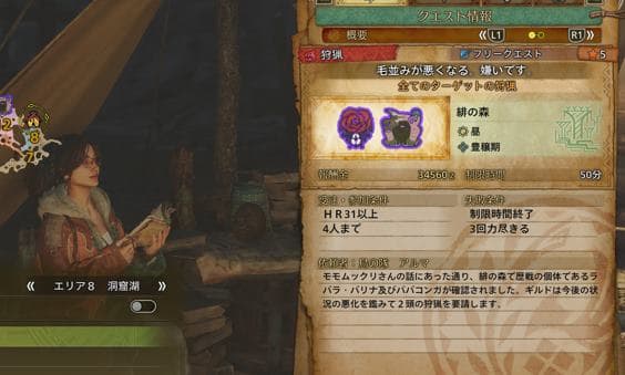 緋の森エリア8の洞窟湖付近に簡易キャンプを設置します。環境を豊穣期に設定しておく