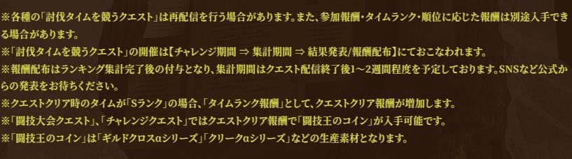 「闘技大会クエスト」、「チャレンジクエスト」ではクエストクリア報酬で「闘技王のコイン」が入手可能です。「闘技王のコイン」は「ギルドクロスαシリーズ」「クリークαシリーズ」などの生産素材となります。