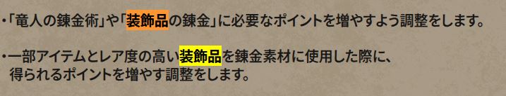 ・「竜人の錬金術」や「装飾品の錬金」に必要なポイントを増やすよう調整をします。