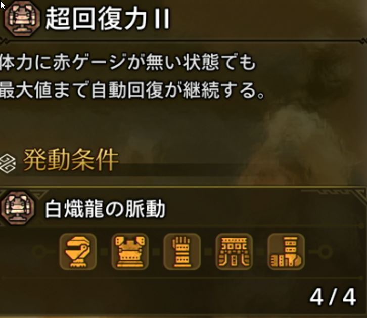 | 4部位 | 超回復力Ⅱ | 体力に赤ゲージが無い状態でも、最大値まで自動回復が継続する。 |