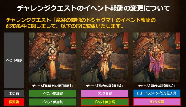 現在開催中のチャレンジクエスト「竜谷の跡地のドシャグマ」のイベント報酬に関しましては、不正行為および不具合により、健全なランキングをご提供できていない状況を鑑みて、添付の形に変更いたします。