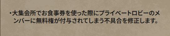 ・大集会所でお食事券を使った際にプライベートロビーのメンバーに無料権が付与されてしまう不具合を修正します。
