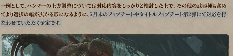 一例として、ハンマーの上方調整については対応内容をしっかりと検討した上で、 その他の武器種も含めてより選択の幅が広がる形になるように、5月末のアップデートやタイトルアップデート第2弾にて対応を行なわせていただく予定です。