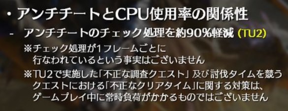 TU2では、アンチチートのチェック処理を約90%軽減する対応を行なっております。 ※アンチチートのチェック処理が1フレームごとに行なわれているという事実はございません