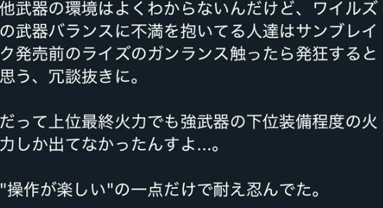 ライズ無印は武器のバランスが悪かったっていうのとガンスが弱かったっていう話を聞いてエアプで適当に書いちゃったんだろうなっていうのが簡単に分かっちゃうんよな